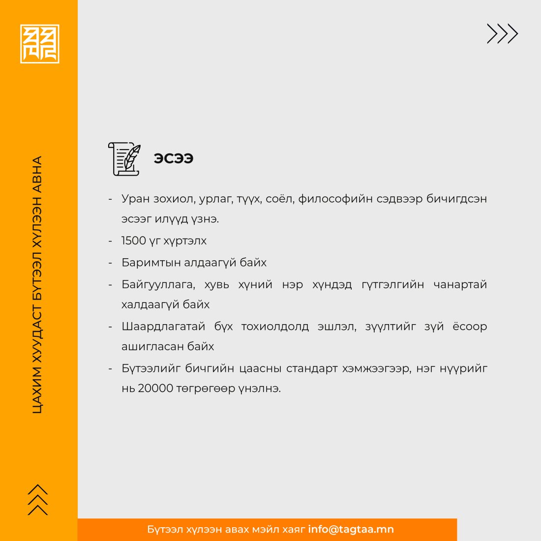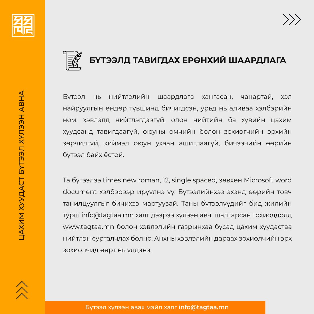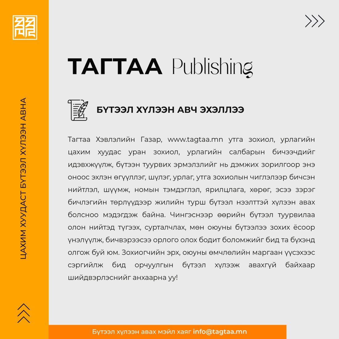 Тагтаа Хэвлэлийн Газар, www.tagtaa.mn утга зохиол, урлагийн цахим хуудас уран зохиол, урлагийн салбарын бичээчдийг идэвхжүүлж, бүтээн туурвих эрмэлзлийг нь дэмжих зорилгоор энэ оноос эхлэн өгүүллэг, шүлэг, урлаг, утга зохиолын чиглэлээр бичсэн нийтлэл, шүүмж, номын тэмдэглэл, ярилцлага, хөрөг, эсээ зэрэг бичлэгийн төрлүүдээр жилийн турш бүтээл нээлттэй хүлээн авах болсноо мэдэгдэж байна. Чингэснээр өөрийн бүтээл туурвилаа олон нийтэд түгээх, сурталчлах, мөн оюуны бүтээлээ зохих ёсоор үнэлүүлж, бичвэрээсээ орлого олох бодит боломжийг бид та бүхэнд олгож буй юм. Зохиогчийн эрх, оюуны өмчлөлийн маргаан үүсэхээс сэргийлж бид орчуулгын бүтээл хүлээж авахгүй байхаар шийдвэрлэснийг анхаарна уу.